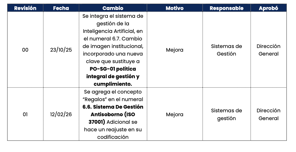 • Revisión anual de la política integral: La Alta Dirección revisará de manera formal la